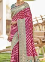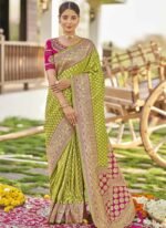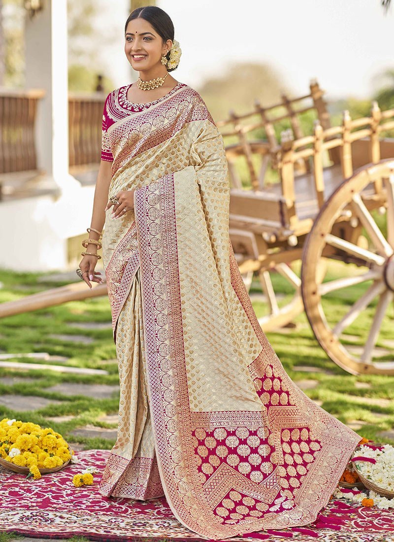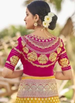 Adorn yourself in the epitome of elegance with this resplendent yellow saree exquisitely crafted to captivate hearts and turn heads. Crafted from luxurious art silk its vibrant yellow hue evokes a sense of joy and radiance perfect for any celebratory occasion. The saree is adorned with intricate Benarasi zari and jacquard work showcasing a harmonious blend of traditional craftsmanship and contemporary allure. The golden motifs delicately woven into the fabric add a touch of regal splendor elevating its allure to new heights. Contrasting the sunny yellow backdrop delicate pink accents grace the saree creating a captivating visual contrast that accentuates its beauty. The subtle yet striking floral and motif work in pink further enhances its charm adding depth and dimension to the ensemble. Completing the ensemble is a meticulously tailored blouse in matching pink customdesigned to complement the saree flawlessly. Embellished with coordinating floral and motif work the blouse adds a touch of sophistication and completes the look with finesse. Indulge in timeless elegance and exquisite craftsmanship with this breathtaking ensemble a true testament to the timeless allure of Indian traditional attire. Whether its a wedding festival or any special occasion this ensemble is sure to make you the epitome of grace and style.