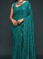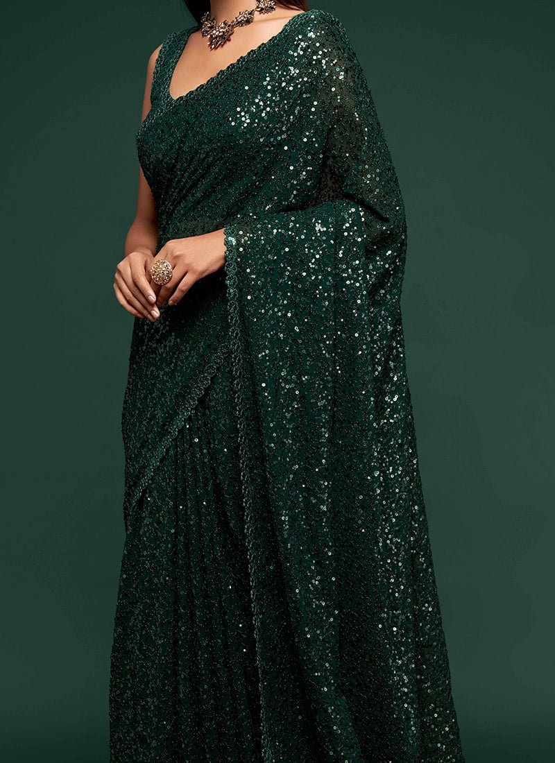 Make the heads turn whenever you dress up in this dark green color georgette saree. This saree is displaying some wonderful work done with embroidered and sequins work look chic. This saree comes with unstiched dark green color georgette blouse.