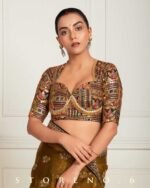 - Multicolor Thread And Sequins Embroidery Works On Black Georgette Blouse With Golden Beads And Tassel Detailing’s On front.