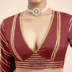Home Blouse Half-Sleeve Blouse Navya x Tyohaar | Auburn Red Elbow Sleeves FlexiFit Saree Blouse with Plunging V Neckline with Tasteful Golden Gota Lace