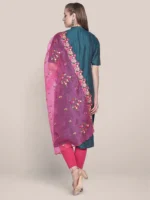 • This light weight organza dupatta is adorned with colourful embroidery all over along with scalloped borders .