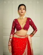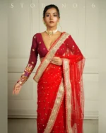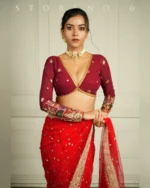 Malika x Rozaana | Deep Neck Saree Blouse in Cranberry Red Linen