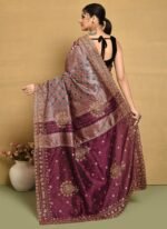 • This exquisite winecolored Kancheepuram silk saree is a perfect blend of tradition and artistry showcasing the finest handembroidered craftsmanship. The saree is made from pure Kancheepuram silk renowned for its lustrous sheen and durable quality. The rich wine hue adds a touch of elegance making it ideal for grand occasions like weddings festivals or special celebrations. The entire saree is adorned with intricate handembroidered patterns showcasing floral motifs and traditional Indian designs creating a luxurious and regal appearance. The craftsmanship on the saree speaks volumes about the skill and dedication of the artisans who have meticulously worked on it making each stitch a piece of art. The embroidery adds depth and texture to the fabric enhancing its overall beauty and making it a showstopper wherever it is worn.